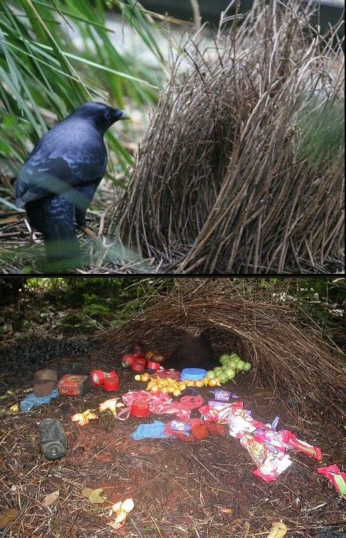 فالذكر الصغير يبدأ بالتقرب من العش وكأنه أنثى، والذكر الكبير يكون سعيد بقدوم أنثى لعشه ولا يعلم إنه فخ ،فيستغل الذكر الصغير ذلك ويسرق القطع الملونة لعشه الخاص به ويترك عش الذكر الكبير خالي من الزينة