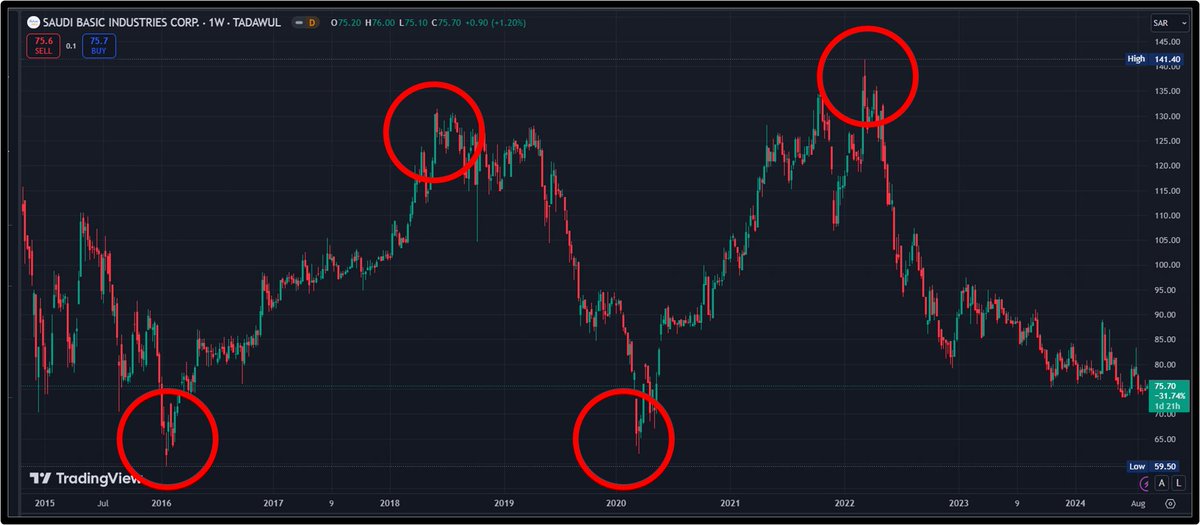 هذا شارت لسعر سهم سابك اخر 10 سنوات