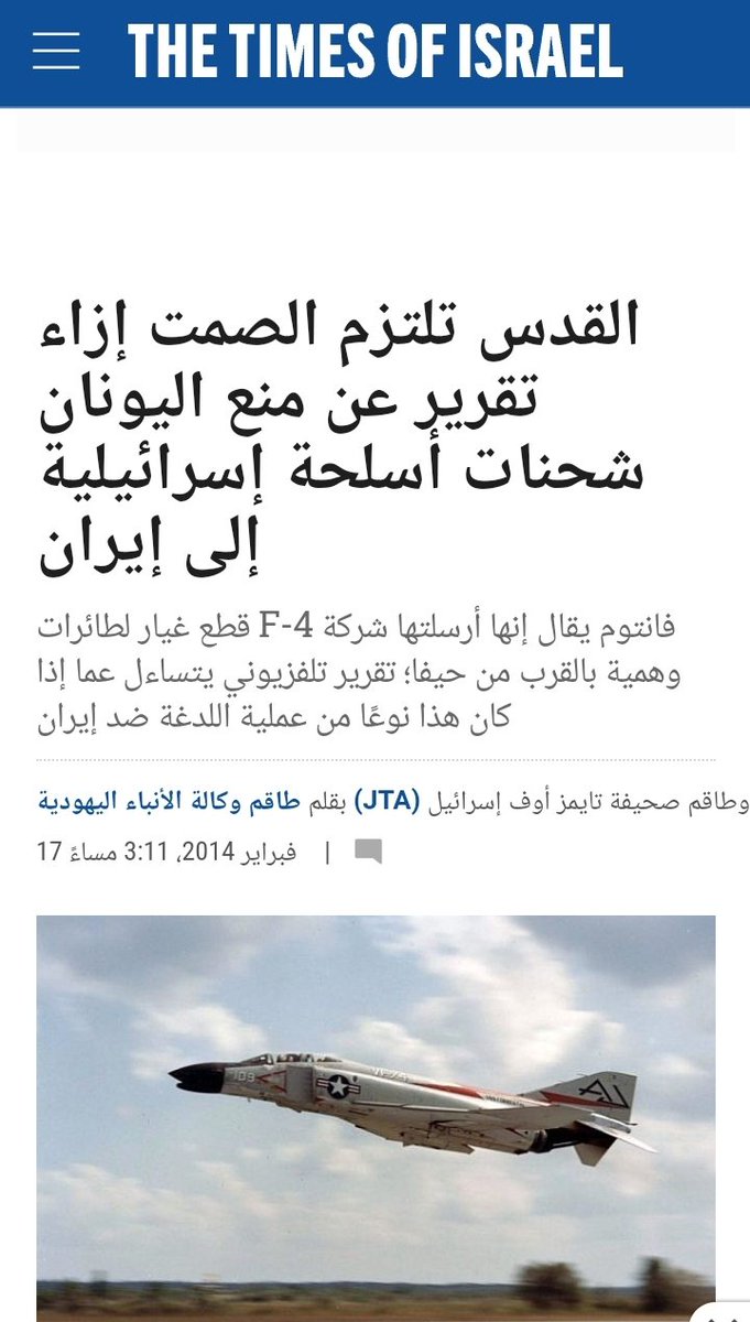 أعلنت السلطات اليونانية على قبضها على حمولات قطع غيار طائرة f-14 تنطلق من شركات “إسرائيلية” في فلسطين المحتلة إلى إيران عن طريق اليونان …! وقد تم العثور على الحمولة الأولى في ديسمبر 2012, والثانية في أفريل 2013, كما في فضيحة إيران كونترا عام ١٩٨٦ .