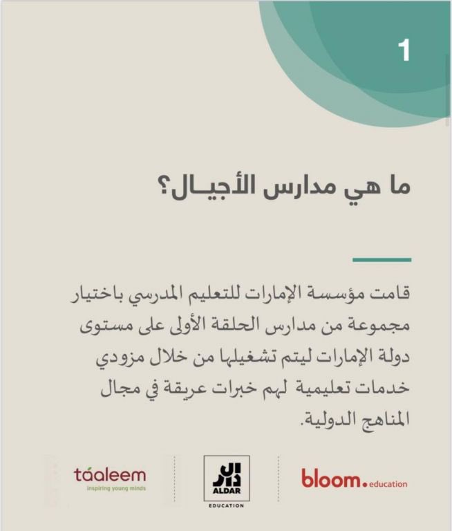 الجهة التابعة: دائرة التعليم والمعرفة في أبوظبي (ADEK) وتديرها شركات مثل بلوم، الدار ، تعليم ، نيو سينشري .