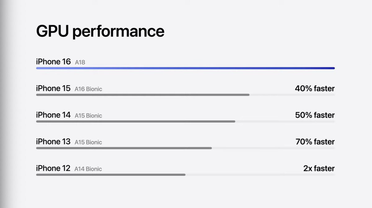 الجهاز مزود بشريحة A18 الجديدة اللي تتميز بأداء GPU أسرع بنسبة 40% وأداء CPU أسرع بنسبة 30% وعرض نطاق ذاكرة أعلى بنسبة 17% مقارنة بـ iPhone 15 — أداء الذكاء الاصطناعي التوليدي أسرع بمرتين