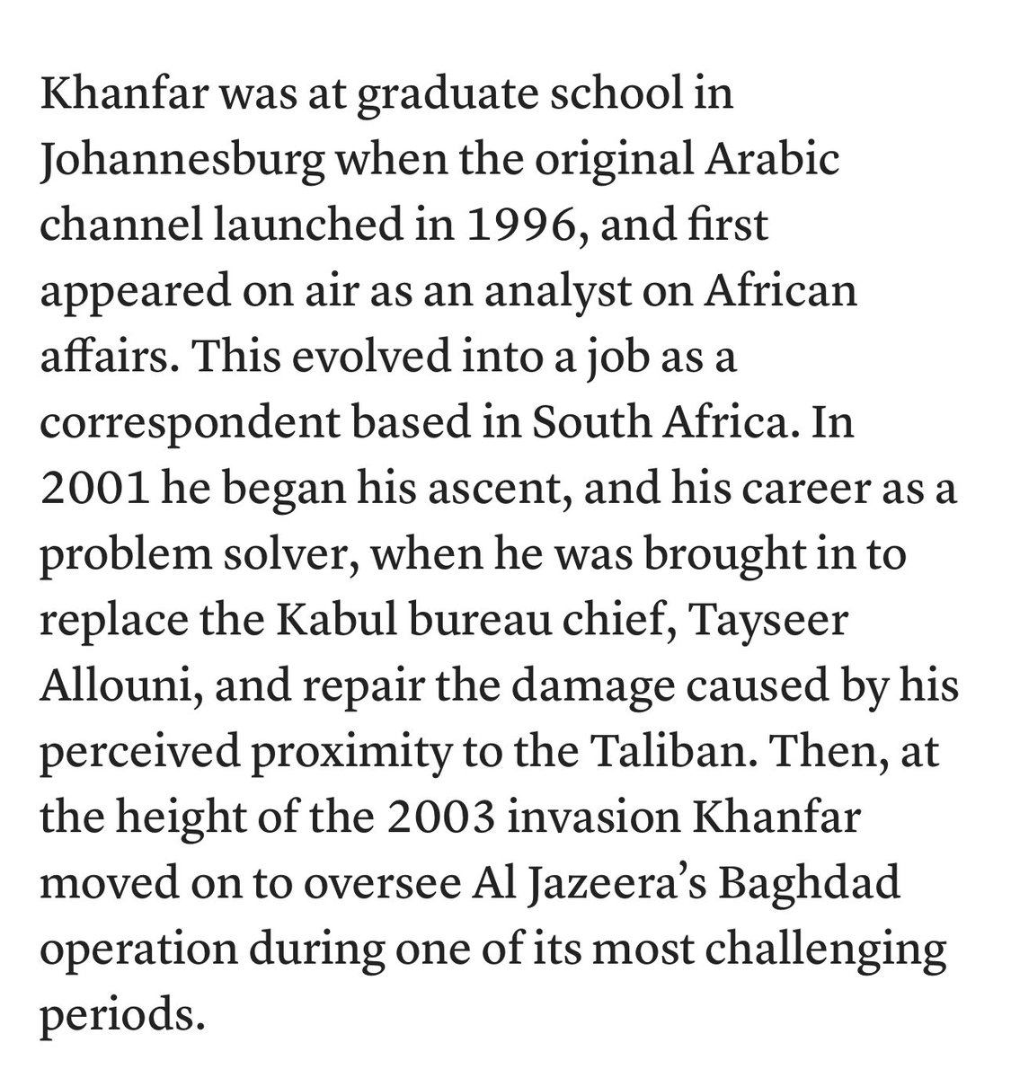 يكون وضاح خنفر حيث تكون الاستخبارات الامريكية، وتاريخه الوظيفي مرتبط معها بشكل كبير. كان خنفر الخيار الامريكي لمنصب مدير مكتب الجزيرة في افغانستان بعد ملاحقة تيسير علوني عام 2001 ثم انتقل لادارة مكتب الجزيرة في بغداد مع بدء الغزو الامريكي للعراق 2003. cjr.org