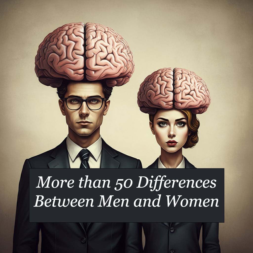 43. التحولات الهرمونية: الرجال يمرون بالعديد من التحولات الهرمونية في مراحل مختلفة مثل البلوغ والأبوة، ولكن تلك التحولات تكون أقل تكرارًا وحدّة مقارنة بالنساء. مثال: النساء خلال دورة الطمث، ينمو الحصين (Hippocampus) لدى المرأة بنسبة تصل إلى 25% في بداية الدورة بسبب تأثير الإستروجين، مما يعزز من وظائف الدماغ ويجعلها أكثر استرخاء وحادة الحواس. ولكن عند حدوث الإباضة، يعكس هرمون البروجسترون تأثير الإستروجين، مما يؤدي إلى تخدير العقل وزيادة الانفعالات وقلة التركيز