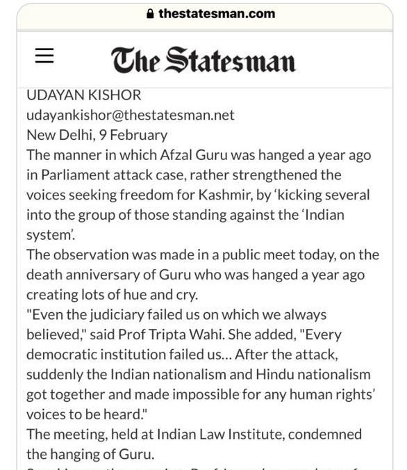 अफ़ज़ल गुरु की फांसी के एक साल बाद, तृप्ता वाही ने एक सार्वजनिक बैठक में कहा कि, “न्यायपालिका ने भी हमें विफल कर दिया, जिस पर हमें हमेशा विश्वास था। हर लोकतांत्रिक संस्था ने हमें विफल कर दिया। हमले के बाद, अचानक भारतीय राष्ट्रवाद और हिंदू राष्ट्रवाद एक साथ आ गए और किसी भी मानवाधिकार की आवाज़ को सुनना असंभव हो गया।