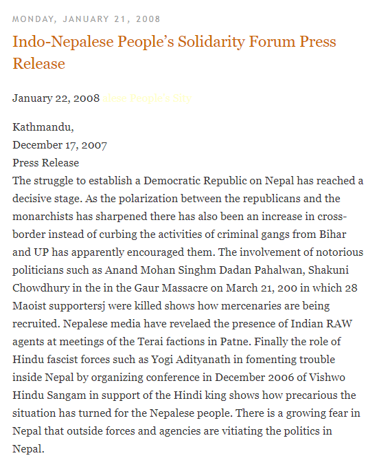 उन्होंने यह भी कहा, “योगी आदित्यनाथ जैसी हिंदू फासीवादी ताकतों द्व्रारा दिसंबर 2006 में नेपाल में विश्व हिंदू संगम का आयोजन करके नेपाल के अंदर अशांति फैलाने से पता चलता है कि नेपाली लोगों के लिए स्थिति कितनी अनिश्चित हो गई है।”