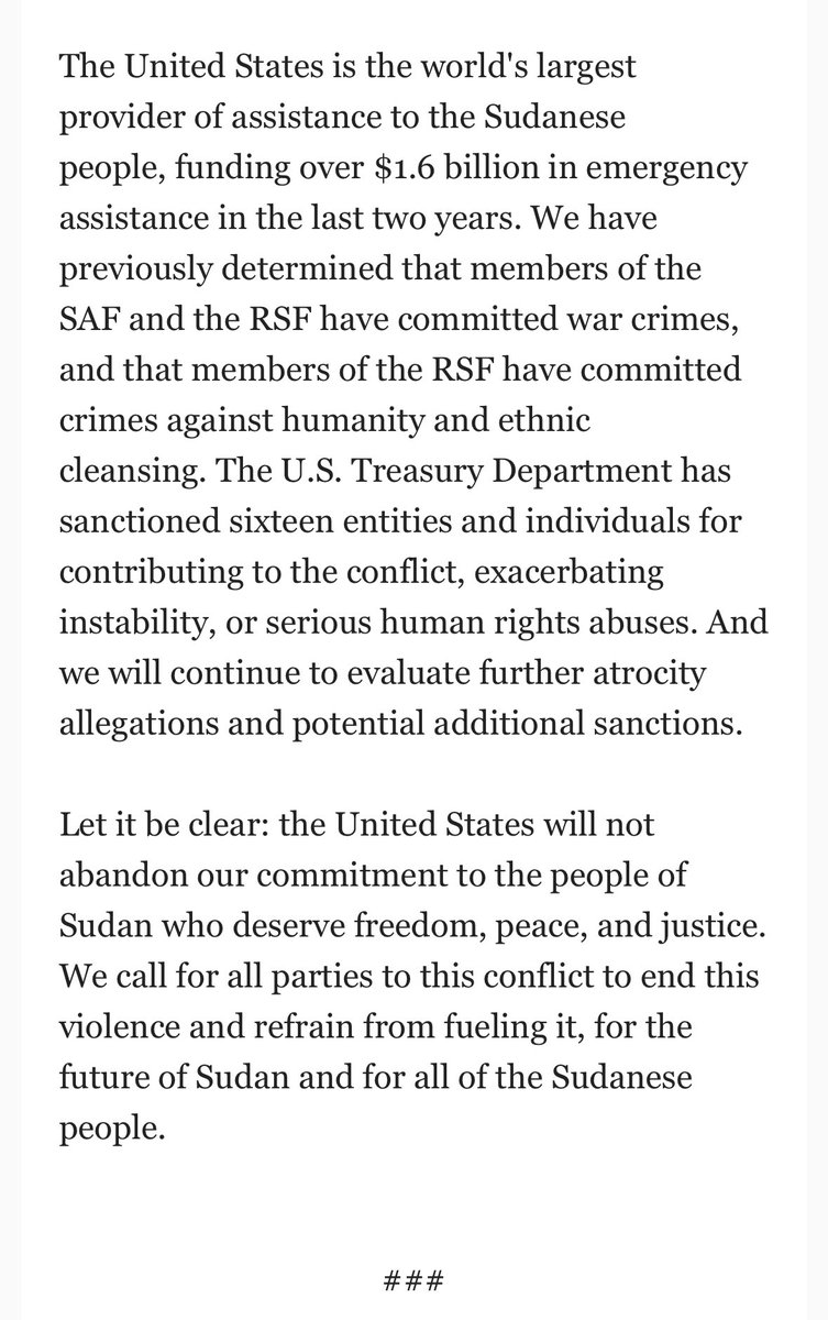 🚨 ولوح #بايدن بالمزيد من العقوبات قائلا": "لقد تبين لنا سابقًا أن أعضاء القوات المسلحة السودانية وقوات الدعم السريع ارتكبوا جرائم حرب، وأن عناصر قوات الدعم السريع ارتكبوا جرائم ضد الإنسانية وتطهير عرقي. "وذكر إلى ان وزارة الخزانة فرضت عقوبات على 16 كيانًا وفردًا… مشيرا" إلى ان مواصلة التقييم مع احتمال فرض عقوبات إضافية