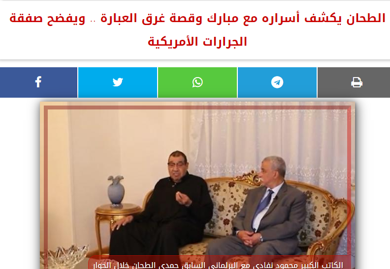 في كتابه "الثورة التائهة" يروي عبدالعظيم حماد "رئيس تحرير جريدة الأهرام الحكومية" شهادة خطيرة من النائب حمدي الطحان "رئيس لجنة النقل والمواصلات في البرلمان وعضو الحزب الحاكم وقتها" عن لقاءات لجنة تقصي الحقائق بمسئولي القوات المسلحة خلال إعدادها للتقرير الذي كان الرأي العام ينتظره بشغف، حيث جرى اللقاء الأول يوم 16 فبراير 2006 وضم حمدي الطحان ومحمد أبو العينين والنائب أمين راضي كممثلين للجنة، أما ممثلو القوات المسلحة الذين حضروا اللقاء فقد كانوا كلا من “اللواء مصطفى السيد رئيس هيئة عمليات القوات المسلحة وقتها ومحافظ أسوان بعد الثورة، واللواء مختار السعيد رئيس مركز البحث والإنقاذ بالقوات المسلحة آنذاك، واللواء ممدوح شاهين رئيس فرع المؤسسات الدستورية والسياسية بالأمانة العامة لوزارة الدفاع وقتها، وشخص غير محدد الهوية يرتدي الملابس المدنية”.👇