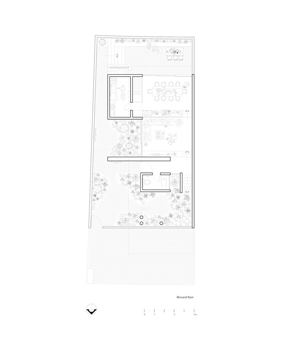 تتجلى هذه الثنائية في جميع مستويات المنزل الثلاثة، حيث تبدأ كل منطقة بمساحة مظلمة ومختصرة، لتكشف بعد ذلك عن بيئة واسعة ومضيئة مع إطلالات على الخارج. وتثري التجربة اليومية تكامل النباتات والرياح والأمطار والسماء في هذه المساحات، التي تؤطر كل منطقة من المنزل.