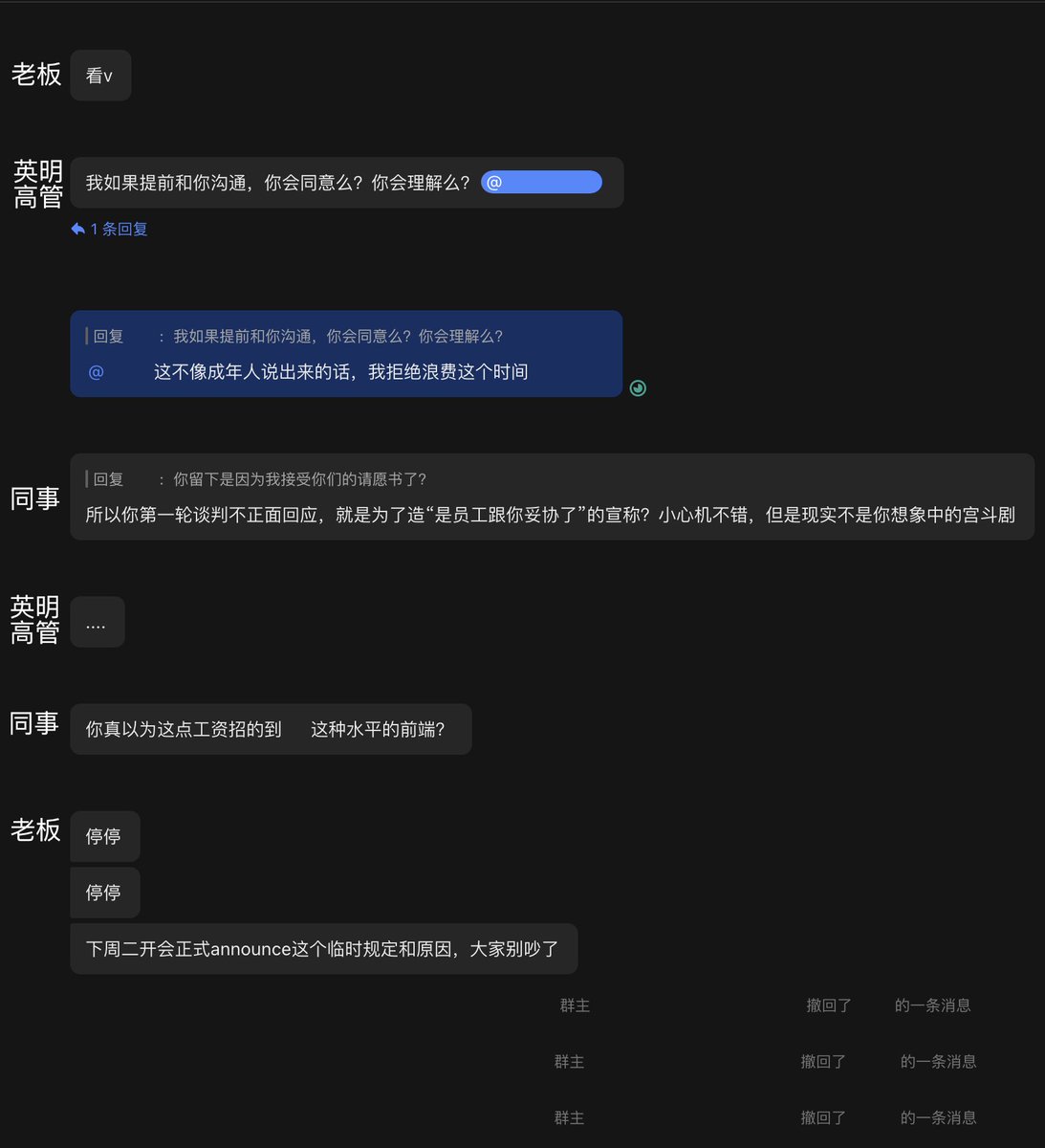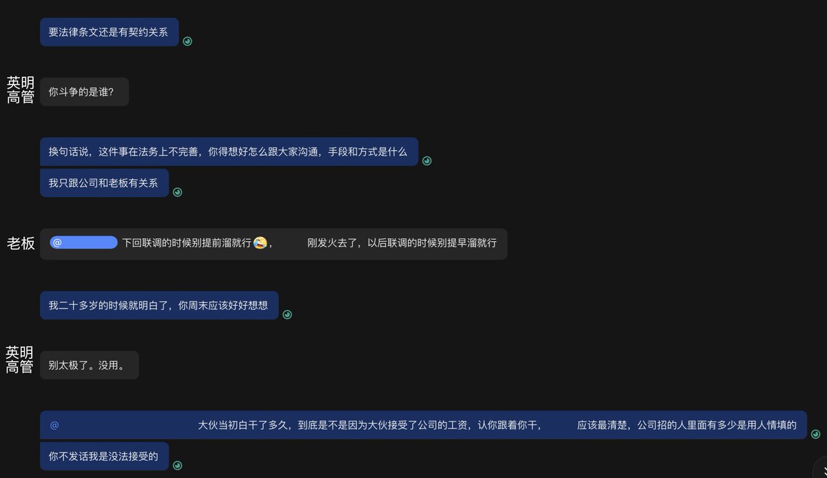当然她一如既往借老板的口说话,甩锅,然后威胁我们。觉得我们开会不够多,一周要多开两次会,除了周会以外,全是听她的垃圾话和「只需要执行(实际无法执行)」的微操指令。最后拿离家出走,要求我们哄她回来——即使她从没加入过公司。