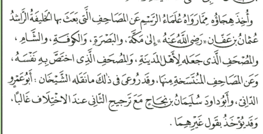 During the third caliph Uthman's reign, in the middle of the 7th century, he established an official standard of the text. This text was written in the spelling norms of the time. This spelling is called the rasm.