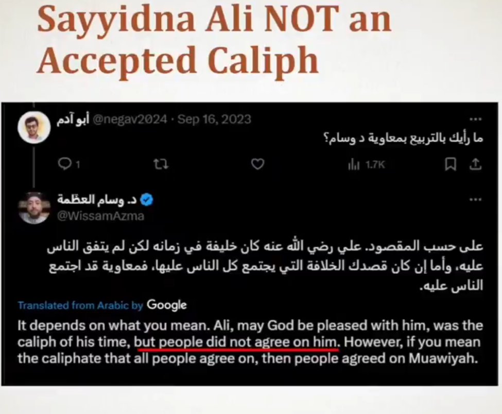 The context is very clear here. I explained that Sayyidna Ali, may Allah be pleased with him, was the caliph during his time, but not everyone agreed upon his rule. Historically, his caliphate was marked by divisions and internal conflicts. This does not imply that those who came after him were better than him, but simply reflects historical reality. The title chosen by Daniel is nothing but a deliberate fabrication.