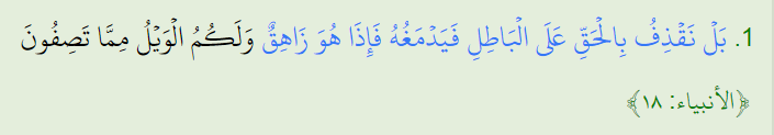 {Rather, We dash the truth upon falsehood, and it destroys it, and thereupon it departs. And for you is destruction from that which you describe.}
