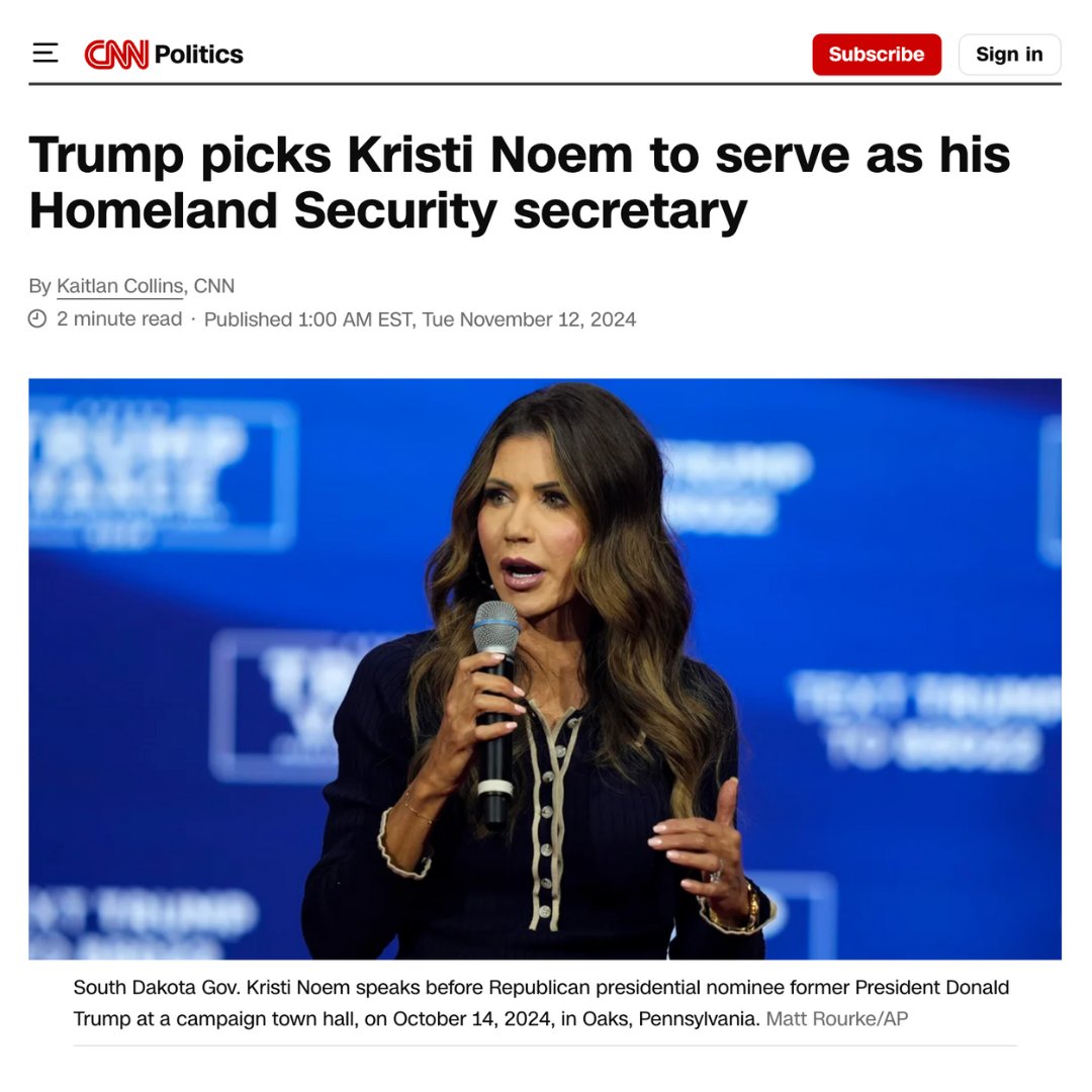 🔴 عين ترامب حاكمة ساوث داكوتا كريستي نويم كوزيرة للأمن الداخلي – نويم وقعت مؤخرًا قانونًا يساوي انتقاد "إسرائيل بمعاداة السامية" 6 x.com