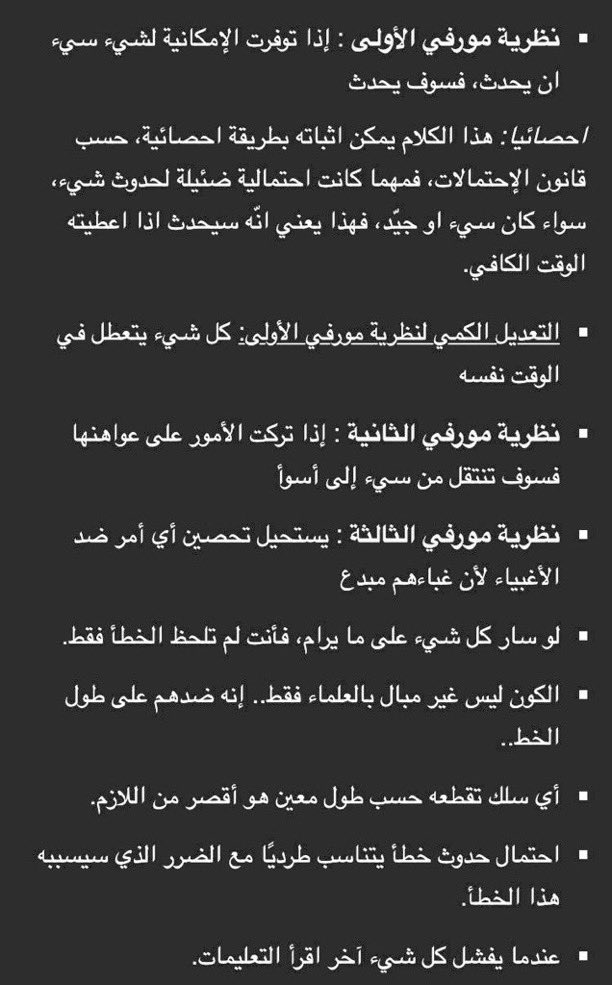 1- نظرية مورفي الأولى : إذا توفرت الإمكانية لشيء سيء ان يحدث، فسوف يحدث
