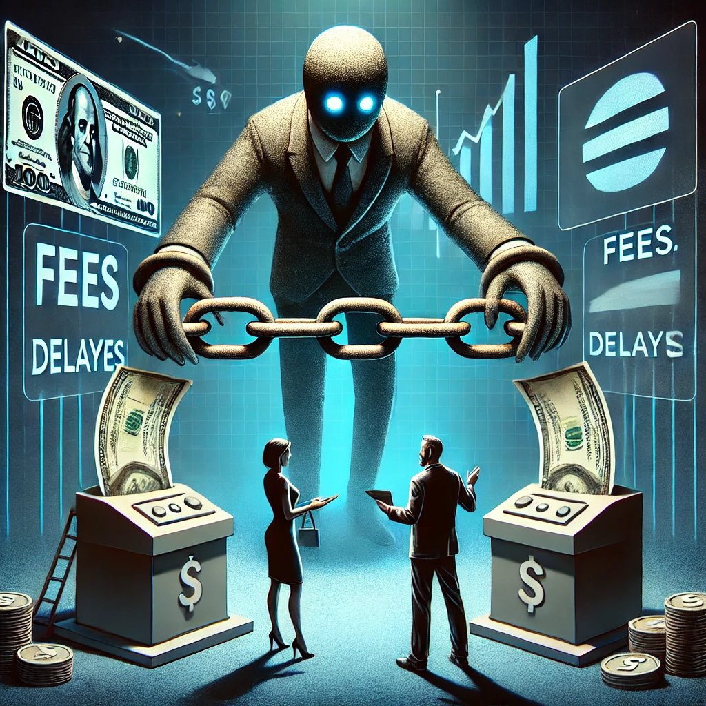 وأصحاب القرار النهائي في مسألة وصول الأموال من عدمها ناهيك عن الاشكاليات المترتبة عن إمكانية الغاء المعاملات و عدم توفر الخصوصية وأجبار مزودي الخدمات على الحصول على معلومات مفصلة عن الجهات والأفراد الراغبين باستخدام خدماتهم وبالتالي يصبحوا عرضة للاختراق والسرقة في حالة .. x.com