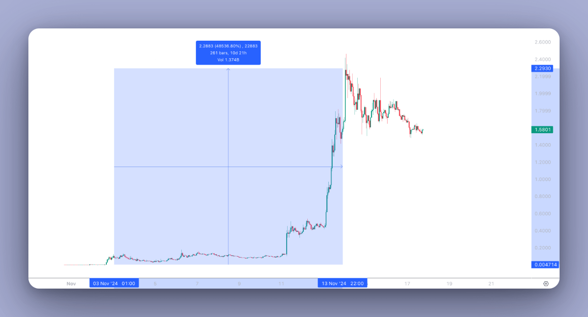 Memecoin hits a $2.4 billion market cap, giving insane returns to early investors.