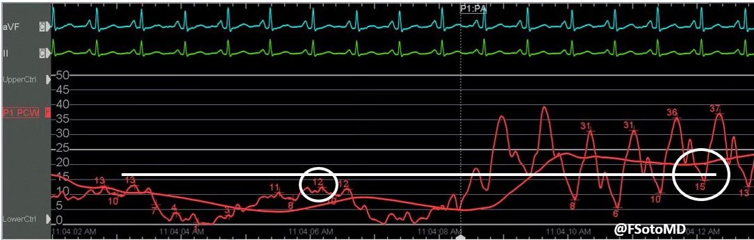 Image 2 shows an over-wedged balloon tip (no respiratory variability) x.com