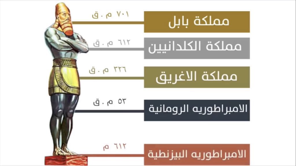 ثم فسر دانيال الحلم وقال، أنت الرأس من ذهب (بمعنى مملكتك هي الرأس)، وبعدها تقوم مملكة اخرى اصغر منك وبالفعل قامت مملكة الكلدانيين، ثم مملكة اخرى تتسلط على كل الارض وبالفعل قامت مملكة الاغريق، ثم تأتي اقوى الممالك كالحديد وبالفعل قامت مملكة (الرومان). x.com