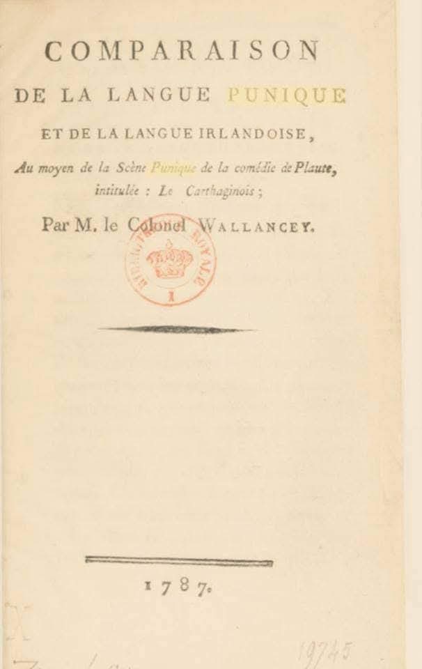 بعنوان "Comparaison de la langue punique et de la langue irlandaide " الصادر في سنة 1787 يؤكد فيها الباحث أن إيتمولوجية كلمات اللغة الإيرلندية هي من أصول بونيقية/فينقية و أن تسمية اللغة الإيرلندية "bearla feni " تعني "اللغة الفينقية " و هذا راجع لإنتشار الثقافة x.com