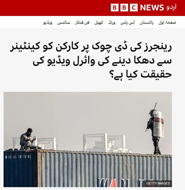 ’’اس وقت تین، چار رینجرز والے وہاں پہنچے اور انھوں نے اس شخص کو گرفتار کرنے کی کوشش کی۔ جب وہ ان کے ہاتھ نہیں آیا تو رینجرز نے اس (شخص) کو تھوڑا سے دھکا دیا اور پھر یہ نیچے جا کر گِرا ہے۔‘‘
