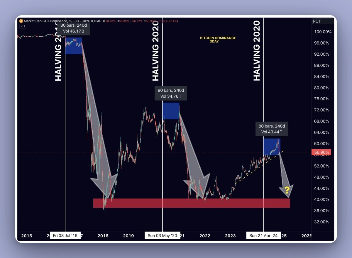 هيمنة البيتكوين $BTC انخفضت إلى حوالي 57%.