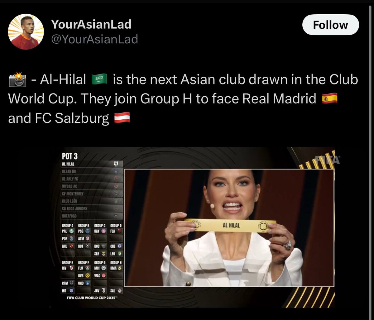 الهلال 🇸🇦 هو النادي الآسيوي التالي الذي تم سحبه في كأس العالم للأندية. ينضمون إلى المجموعة H لمواجهة ريال مدريد 🇪🇸 ونادي سالزبورغ 🇦🇹 x.com