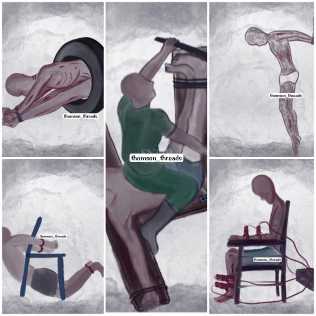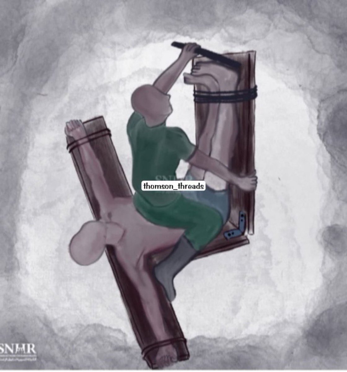 - الحرق بأكياس نايلون: إشعال أكياس نايلون وإذابتها على مناطق من جسد المعتقل كالصدر والبطن والظهر والأرجل واليدين. x.com