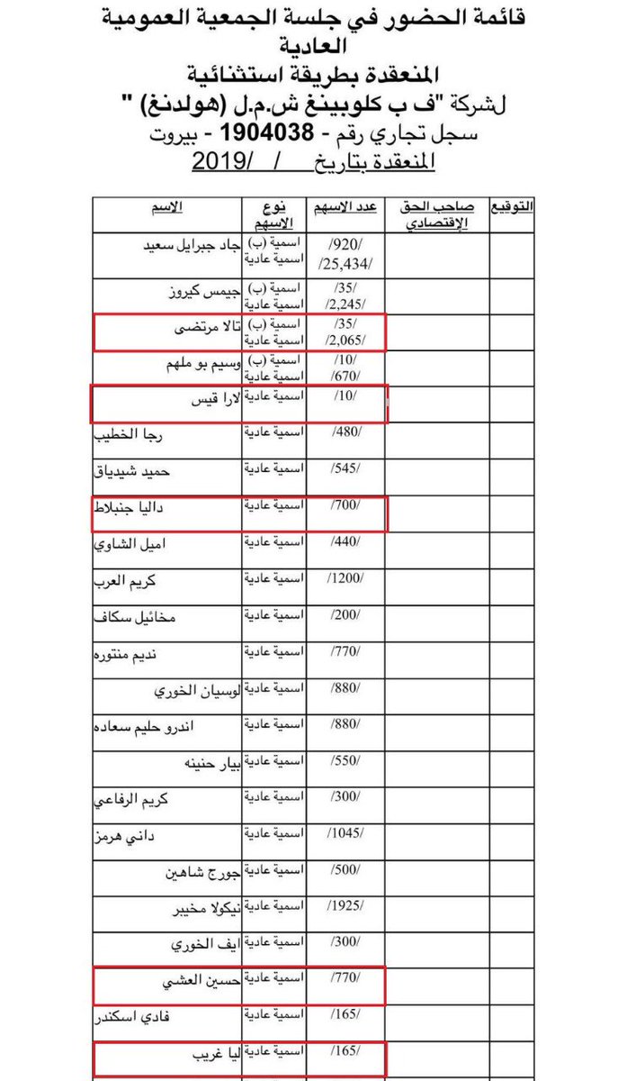 🟥 هنا تبرز علاقتها الوطيدة بشبكة تمويل حزب الله و النظام السوري. فهي تشارك في الأسهم ابنة اصف شوكت زوج بشرى الأسد و على علاقة جيدة بها. و أيضا تبرز صداقتها و اقترانها بمحامي رامي مخلوف و النظام السوري و شبكة تمويل حزب الله الإستاذ حسين عشي. الذي اعتقل بسبب تعاطيه الكوكايين- x.com