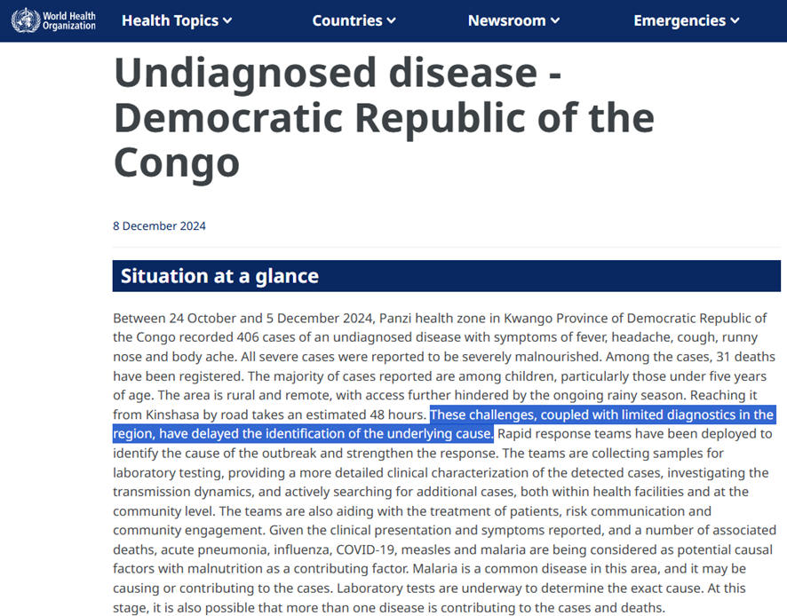 🧶Contrariando as previsões do CDC África🇺🇸 e da própria OMS, a identificação da causa dos 406 casos de doença não-identificada na República Democrática do Congo, contabilizando 31 mortes (ou mais de 70, a depender da estatística utilizada), não ocorreu neste final de semana.> x.com