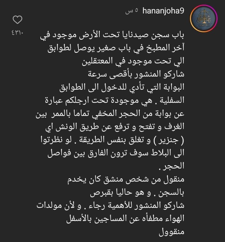 باب سجن صيدنايا تحت الأرض موجود بآخر المطبخ في باب صغير يوصل للطوابق الي تحت موجود في المعتقلين البوابة التي تأدي للدخول الى الطوابق السفلية . هي موجودة تحت ارجلكم عبارة عن بوابة من الحجر المخفي تماما بالممر بين الغرف و تفتح وترفع عن طريق الونش اي جنزير) وتغلق بنفس الطريقة.يتبع👇🏼