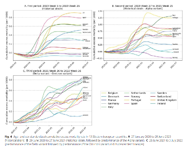 @le_Parisien On voit ici, période par période (souche ancestrale, variant Alpha puis variant Delta), l'excès cumulé de mortalité pays par pays.