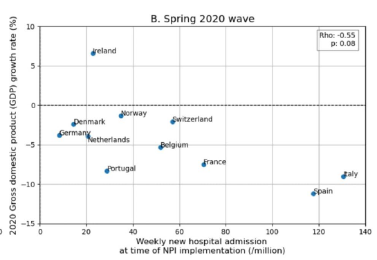 @le_Parisien Par ailleurs, "plus les pays ont réagi rapidement, plus vite ils ont pu assouplir les mesures, et moins leur PIB a été impacté en 2020", comme on le voit ici (l'impact sur le PIB est en axe vertical).