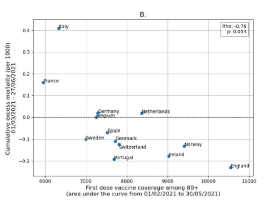 @le_Parisien Parlons désormais de la vaccination. Là aussi, un effet est bien visible : les pays qui ont vacciné le plus vite leurs personnes âgées d'au moins 80 ans affichent l'excès de mortalité le plus faible sur cette période.