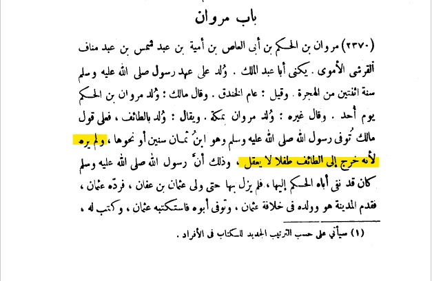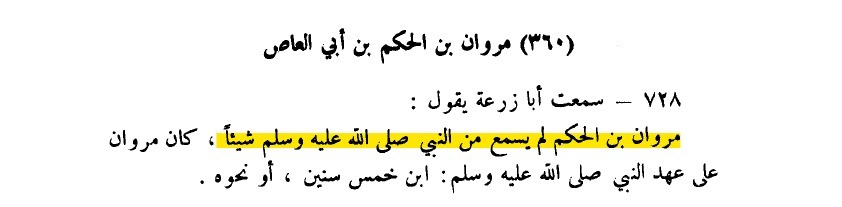 @rhg7684 فقد قال الإمام الترمذي: (سألت محمدا -يعني البخاري- قلت له: مروان بن الحكم رأى النبي صلى الله عليه وسلم؟ قال لا) (تحفة التحصيل ص٢٩٨).
