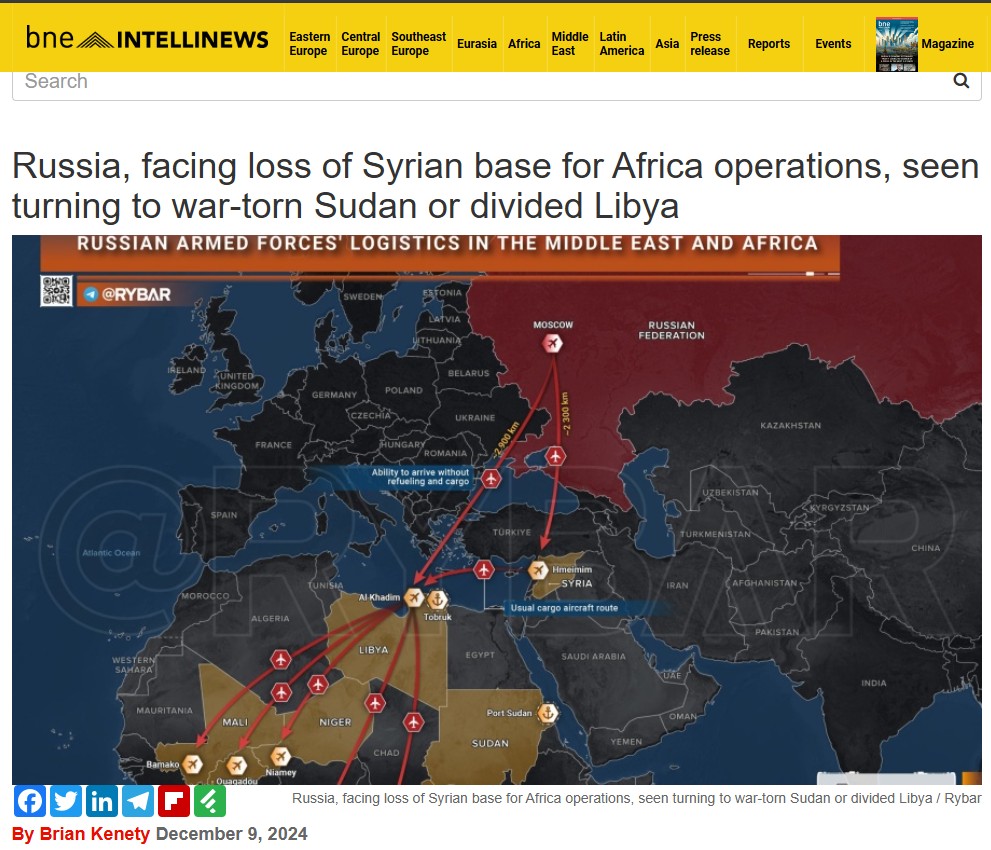 وكتبت "معهد دراسة الحرب" (ISW) في 4 ديسمبر: "سيناريو سقوط الأسد على يد المتمردين سيضر بالأهداف الاستراتيجية للكرملين المتعلقة بإفريقيا والممرات المائية المحيطة، مثل إبراز القوة في البحرين المتوسط والأحمر وتهديد الجناح الجنوبي للناتو".