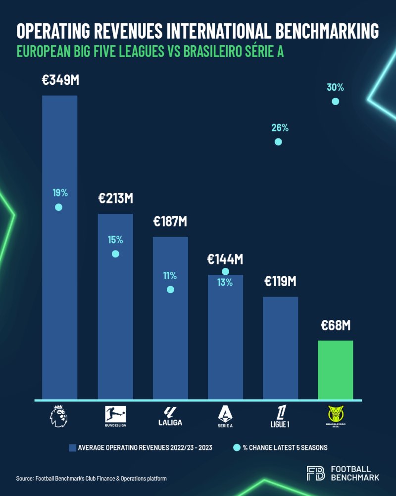 ومع ذلك، فإن أحدث متوسط لإيرادات التشغيل لكل نادٍ في الدوري البرازيلي هو 68 مليون يورو، وهو رقم قليل للغاية مقارنة بفرق الدوري الإنجليزي والتي حققت 349 مليون يورو في 2022/23 أي 5 أضعاف.