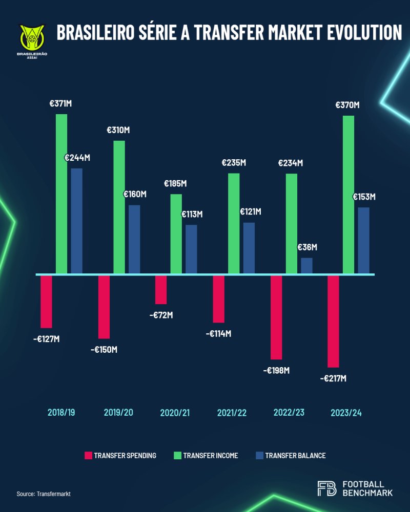 تعد تجارة اللاعبين مصدرا مهما للدخل للأندية البرازيلية. على مدار المواسم الستة الماضية (2018/19 إلى 2023/24) حققوا 1.7 مليار يورو من دخل الانتقالات، بمتوسط 284 مليون يورو سنويا.