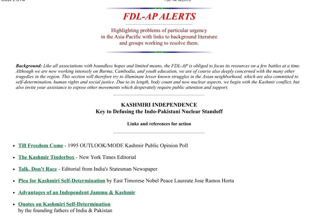 FDL-AP frames the Kashmir issue as a moral and strategic imperative for international attention, portraying Indian sovereignty over the region as the primary obstacle to peace.