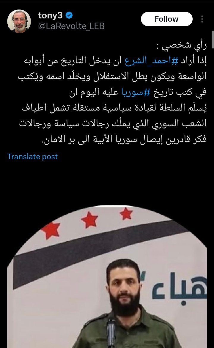 - الشرع أصبح عسكري من طراز رفيع وسياسي متمكن وبطل بارز وخلد اسمهحرر بلده دون دعم أو توجيه فلماذا يسلم القيادة لغيره؟. كل صفات القيادة تنطبق عليه!.