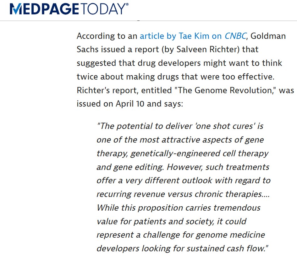Goldman Sachs, compagnie mondiale de gestion d’actifs, «a publié un rapport (rédigé par Salveen Richter) qui suggérait que les développeurs de médicaments devraient réfléchir à deux fois avant de fabriquer des médicaments trop efficaces.»