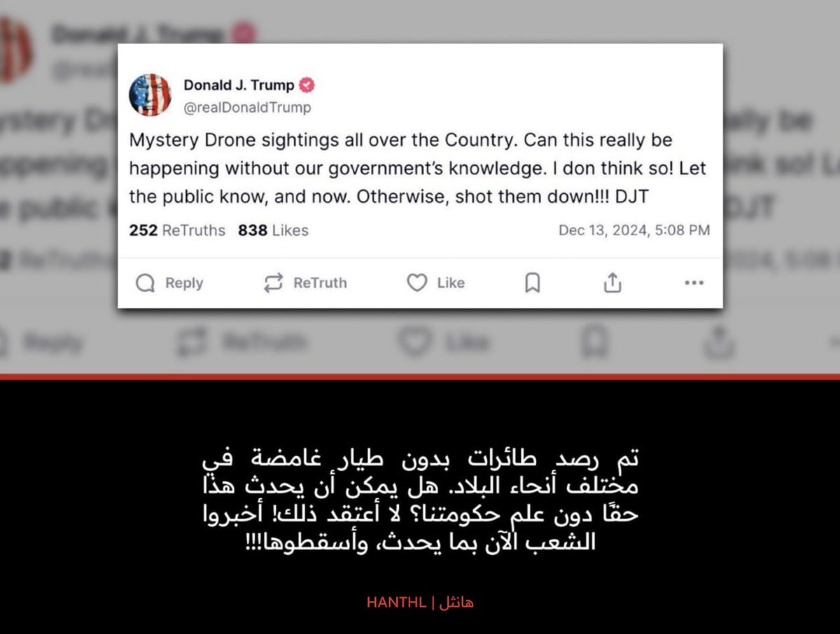 "طائرات مسيّرة غامضة تتجول في البلاد، هل يمكن أن يحدث هذا بدون علم حكومتنا!؟ لا أعتقد! أخبروا المواطنين بما يحدث الآن! أو أسقطوها!"