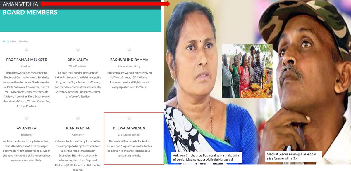 But most striking part of Bejwada Wilson's resume is that he is a board member of Aman Vedika Society. In 2018 BJP National Spokesperson disclosed that Ankineni Sirisha alias Padma alias Nirmala, wife of senior Maoist leader Akkiraju Haragopal was employed by Aman Vedika Society in Telangana post her release from the jail.