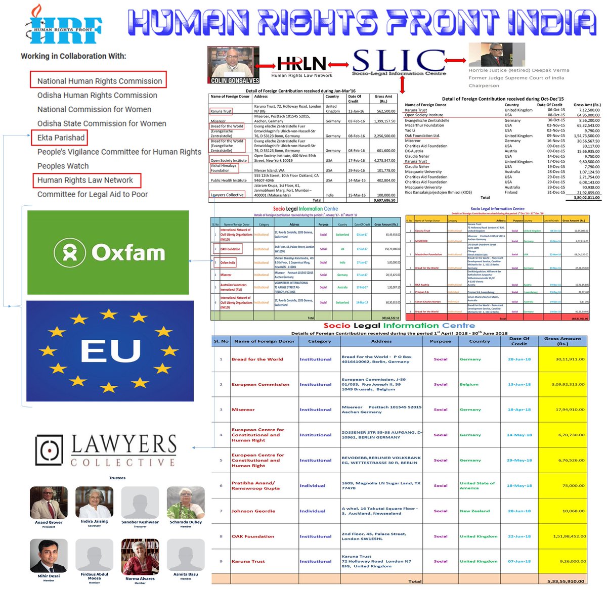 Oxfam also funds Justice Deepak Verma's SLIC which is parent organization of HRLT of Advocate Colin Gonsalves.
