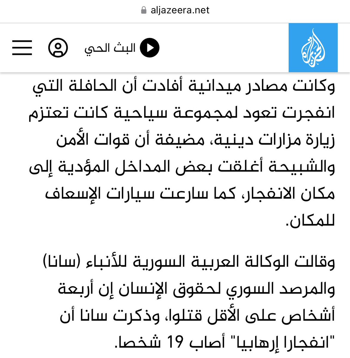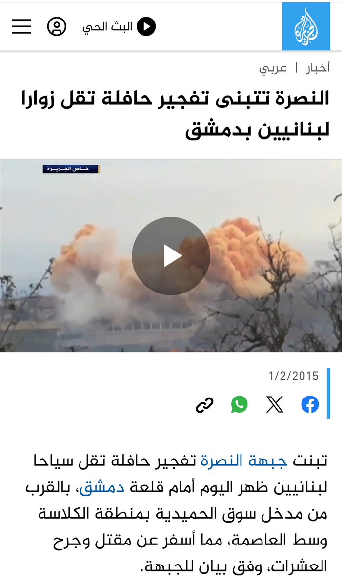 في شهر فبراير ٢٠١٥ تبنت جبهة النصرة تفجير حافلة لبنانية على متنها سياح شيعة في رحلة سياحية لدمشق، ليسوا عسكريين ولا جنودا تابعين لحزب الله ولا للنظام، دخل شخص بحزام ناسف وسط الحافة وفجرها، دون تمييز! عشرات الأشخاص كانوا في عداد القتلى والجرحى، دمهم في رقبة الجولاني ٣/٧ x.com