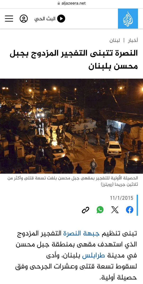 في ٢٠١٥ في مدينة طرابلس اللبنانية تبنت جبهة النصرة تفجيرا مزدوجا داخل مقهى أبو عمران في جبل محسن، أغلب مرتاديه شيعة من الحزب الوطني الديموقراطي لكنهم ليسوا عساكر، الحصيلة تسعة قتلى و ٣٧ جريح، الغاية الثأر لأهل السنة كما جاء في البيان، دماؤهم في رقبة الجولاني ٤/٧ x.com