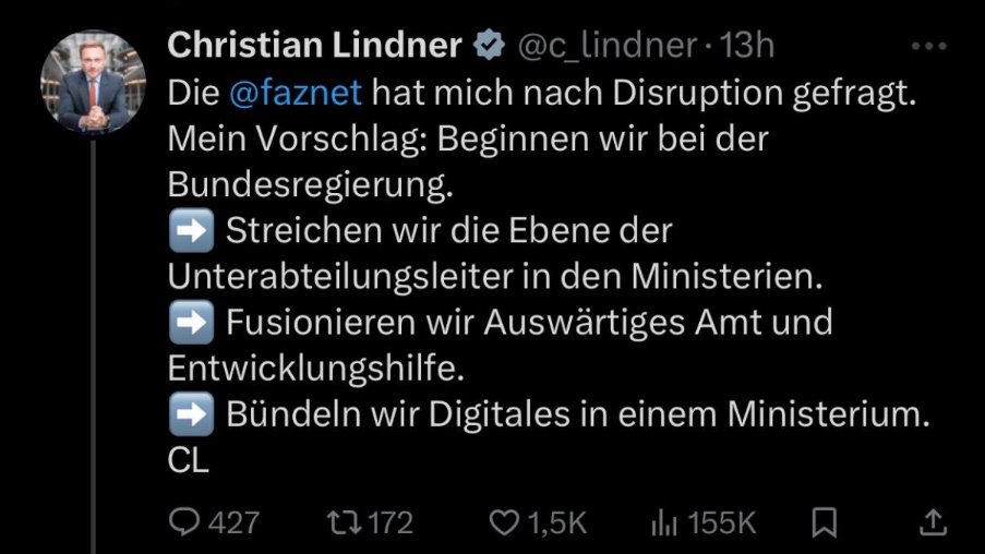 Der gesamte Etat aller Bundesministerien (also der Ministerien selbst nicht vom nachgeordneten Bereich) liegt im Entwurf des #Haushalt 2025 bei ca. 5,3 Mrd. Davon entfällt knapp die Hälfte auf Personalkosten. Sparen wir davon 10% haben wir etwa 260 Millionen Euro gespart. 13/15