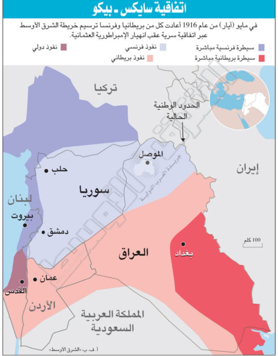 في عام 1916،خلال الحرب العالمية الأولى، عقدت اتفاقية سايكس بيكو السرية بين بريطانيا وفرنسا،بموافقة روسيا القيصرية، لتقسيم مناطق النفوذ في الوطن العربي بعد انهيار الدولة العثمانية.