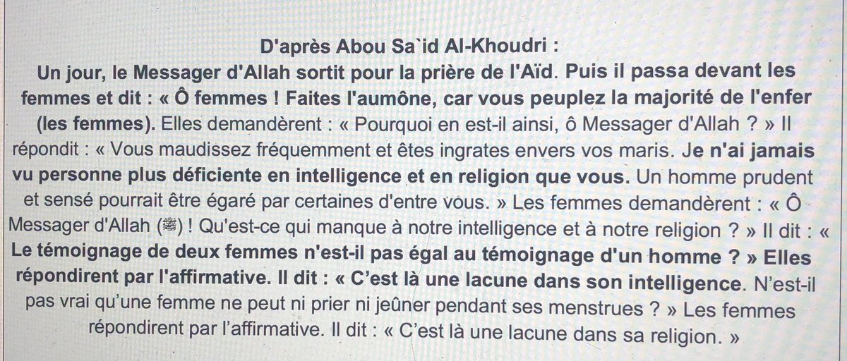 Dans le verset 2:282 Allah nous explique que le témoignage d’une femme vaut 2 fois moins que celui d’un homme (pratique pour les accusations de viols ou agressions) x.com