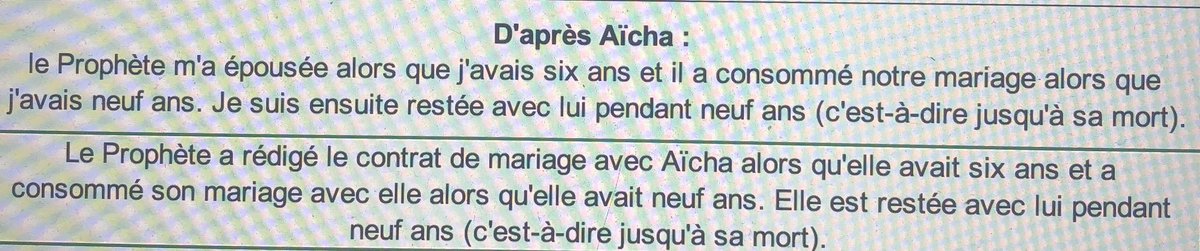 Ici on a le témoignage d’Aicha qui affirme qu’elle s’est marié avec Mahomet a 6 ans et qu’elle s’est fait consommée (violée) à 9 ans.