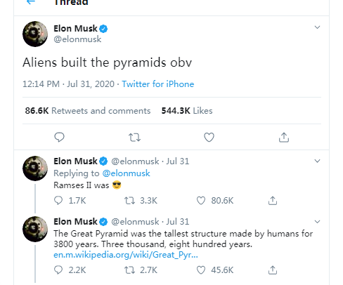 تحت التغريدة شارك إيلون أيضًا بعض الإعجازيات في الهرم الأكبر في الجيزة. x.com